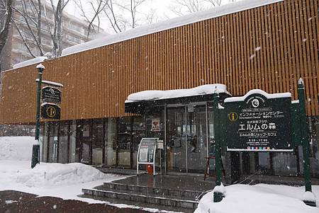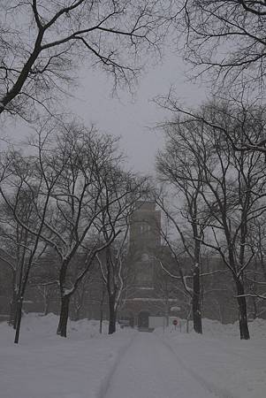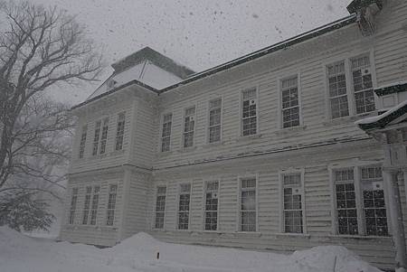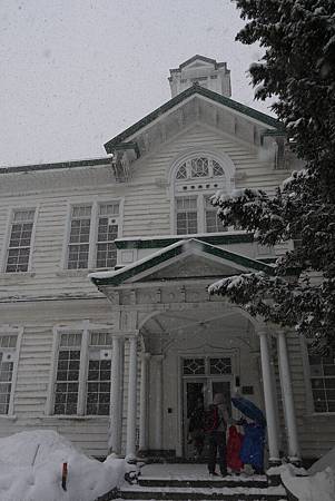 這是「古河講堂」。是舊東北帝國大學農科大學林學教室,1909年竣工,是日本國定登錄有形文化財。建築優雅而美麗,但進門處有個小木牌以日文寫著,請遊客不要進入參觀。的確不應該打擾別人上課,所以我們在這個屋簷下稍稍休息,拍拍身上及臉上、背包上的積雪,繼續往前走。
