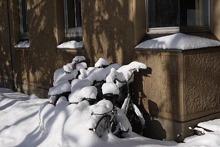 腳踏車上也積滿了雪。反正冬天的校園裡也騎不了腳踏車。