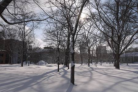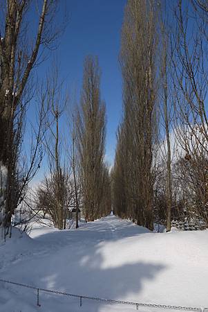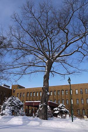 這是並木步道,寒冬裡的白楊木,葉子都掉光了。據在日本拿的資料,上面寫著平成十六年颱風過境,其後並木倒塌近五成,後來校方將倒塌的並木扶起。現在步道是禁止進入的,但光從外頭看,樹葉落盡的北國藍天,自成一種美感。