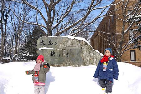 準備離開北海道大學了。在校門口附近,拍下了這個創校副校長克拉克博士的名言:「年輕人要胸懷大志」。兩位幼年的主角也要胸懷大志哦!